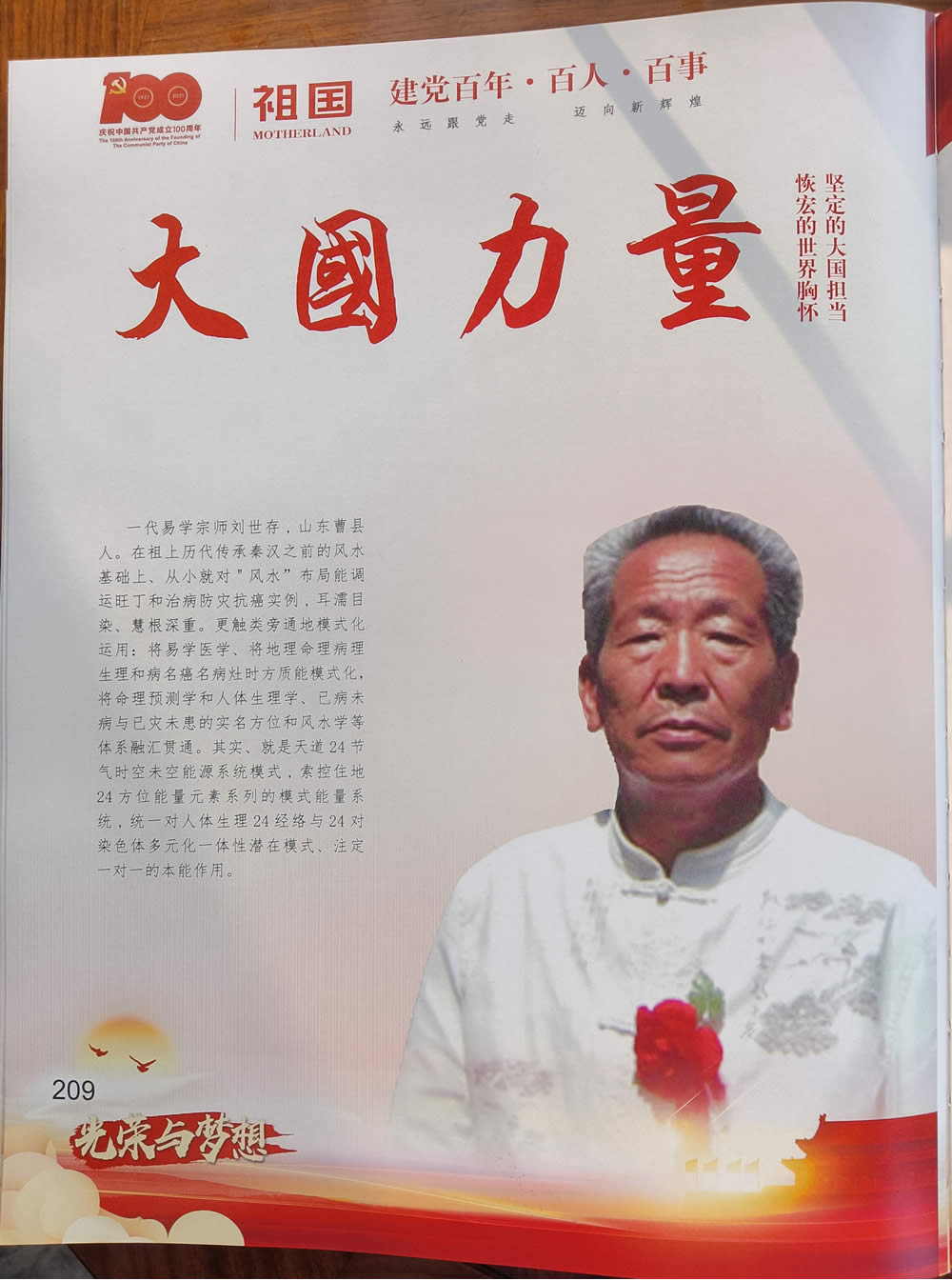 一代易学宗师刘世存,山东曹县人。在祖上历代传承秦汉之前的风水基础上、从小就对风水”布局能调运旺丁和治病防灾抗癌实例,耳濡目染、慧根深重。更触类旁通地模式化运用:将易学医学、将地理命理病理生理和病名癌名病灶时方质能模式化,将命理预测学和人体生理学、已病未病与已灾未患的实名方位和风水学等体系融汇贯通。其实、就是天道24节气时空未空能源系统模式,索控住地24方位能量元素系列的模式能量系统,统一对人体生理24经络与24对染色体多元化一体性潜在模式、注定一对一的本能作用。他始终坚持理论连系实际,关注民生疾苦和解决现实问题:对种种癌症与种种病伤灾殃和车祸官非刑事民事案件、对已病未病与已灾未患、对种种这科那科病伤灾、对常见病与疑难杂症、综合症与实发病、白血病、皮肤病、红斑狼疮、大龄单身、克妻克夫、生死离别、自闭症、抑郁症、精神分裂症、痛风类风湿、脊髓空洞症、梅迷尔综合症、渐冻人、对生成之人与未成之体和各人的精气神质形态因素、对遗传性克灭某一门人丁或基因遗传种种病伤灾害祸殃癌症致命、对个人经济与企事业经济的天因地因与时因人因定位治理、对治病防灾调运诸方面的人人急需和社会健康发展共需与必需,集成模式化版块运用,如用多功能手机一样容易。凡是知道东西南北、有方向感的人,都能学会应用。一定要明白:是针对病名灾殃名癌名的一定一方位整改治理!!绝不是用什么针药针对人体!!