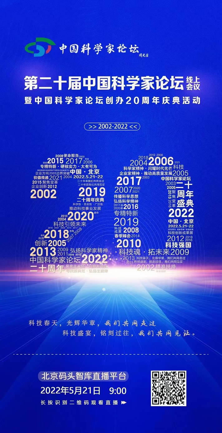 近日从中国科学家论坛组委会获悉,第二十届中国科学家论坛将于2022年5月21-22日在北京召开,主题为:科技创新赋能新时代高质量发展。