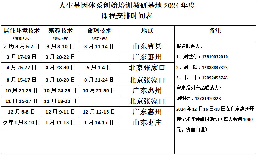 《人生基因体系》创始培训教研基地2024年度课程安排时间表