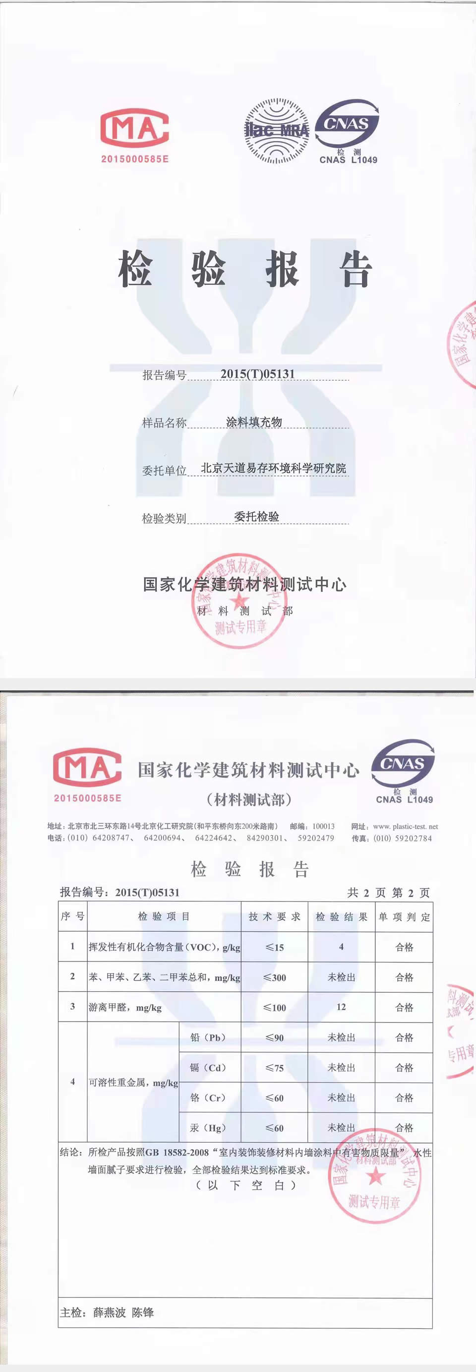 祝贺北京天道易存环境科学研究院专利产品:涂料填充物获国家化学建筑材料测试中心检验通过
