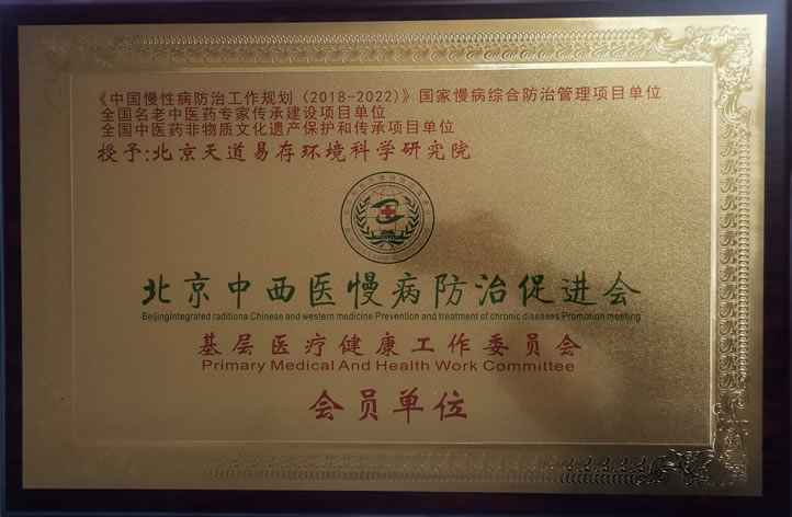 北京天道易存环境科学研究院被:北京中西医慢病防治促进会基层健康工作委员会授予会员单位!