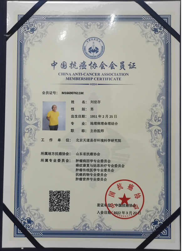 北京天道易存环境科学研究院院长刘世存被中国抗癌协会评定为《主治医师》